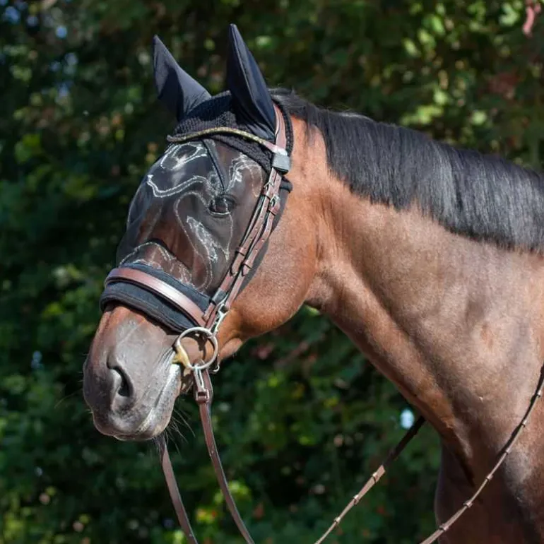 Bonnet combiné anti-mouches, à fixer sur le bridon. Un bonnet combiné avec un masque anti-mouches en maille fine, léger et très efficace au travail.
