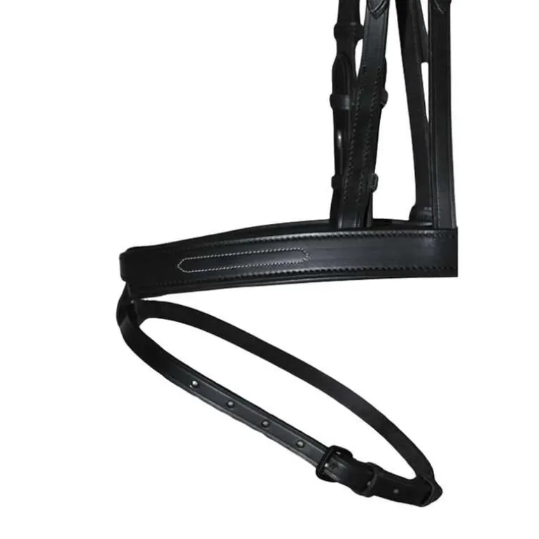 Réalisé en cuir de buffle italien 1er choix semi-aniline, ce bridon allie souplesse, résistance et élégance, avec une bouclerie en acier inoxydable noir et des coutures blanches contrastées qui soulignent sa finition haut de gamme.