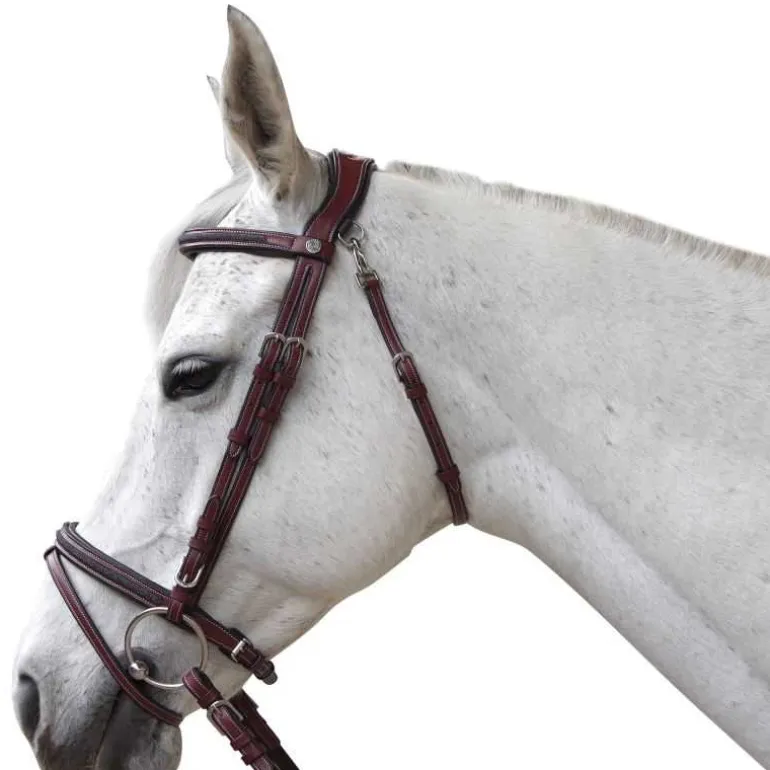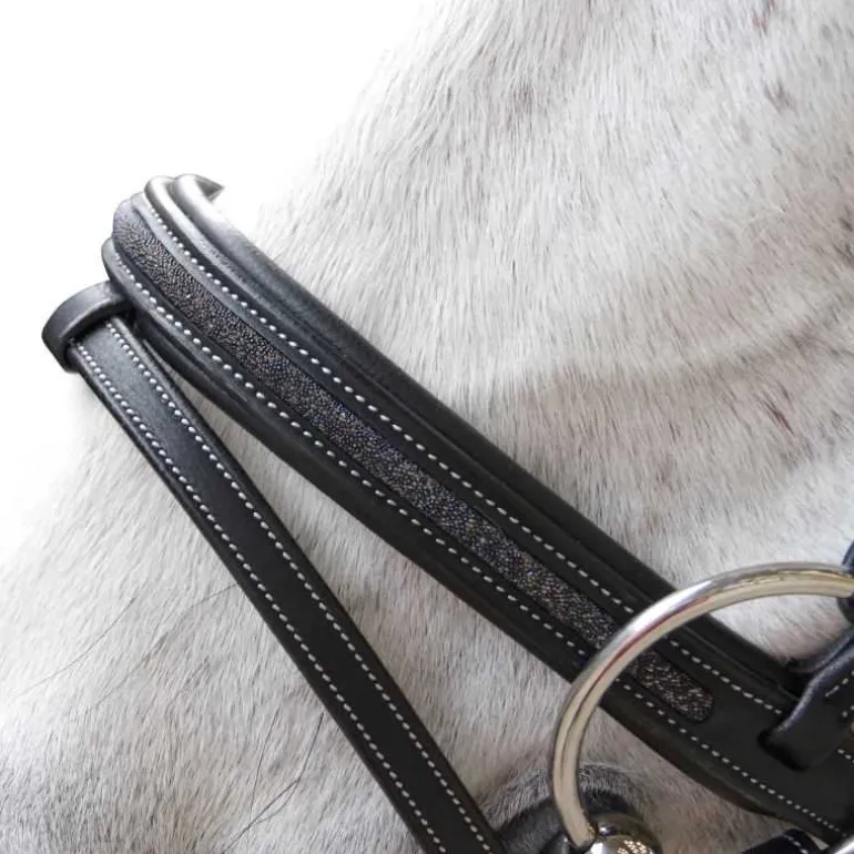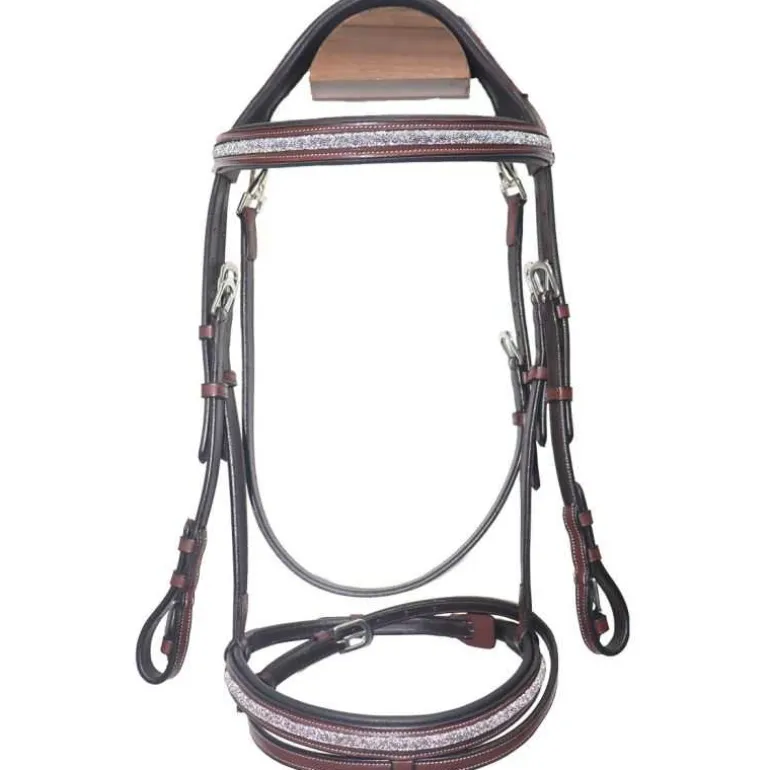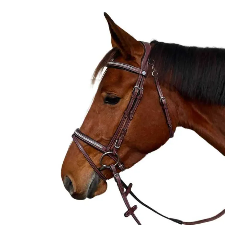 Très joli bridon Aachen Flags&Cup en cuir de belle qualité surpiqué contrasté. Frontal et muserolle ornés de mini perles brillantes pour un effet étincelant.