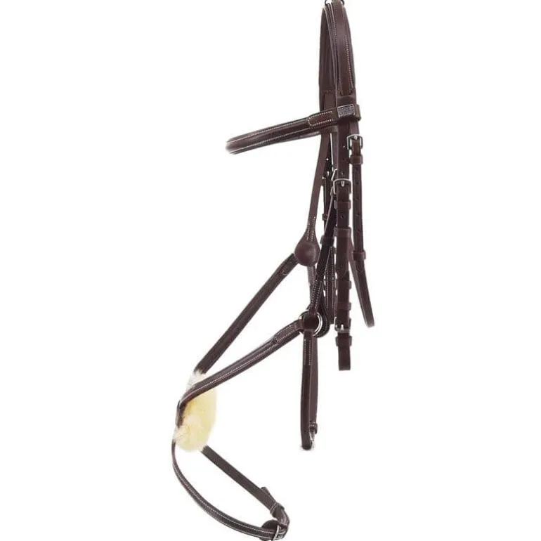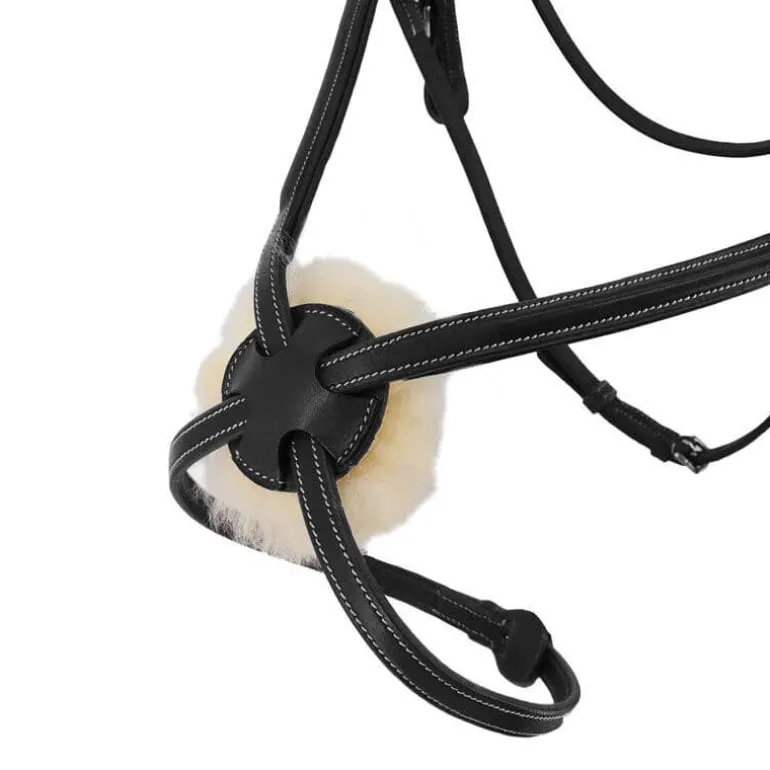 La muserolle est élargie sous la boucle pour éviter le contact direct avec le cheval et passe au dessus de la têtière pour mieux répartir la pression.