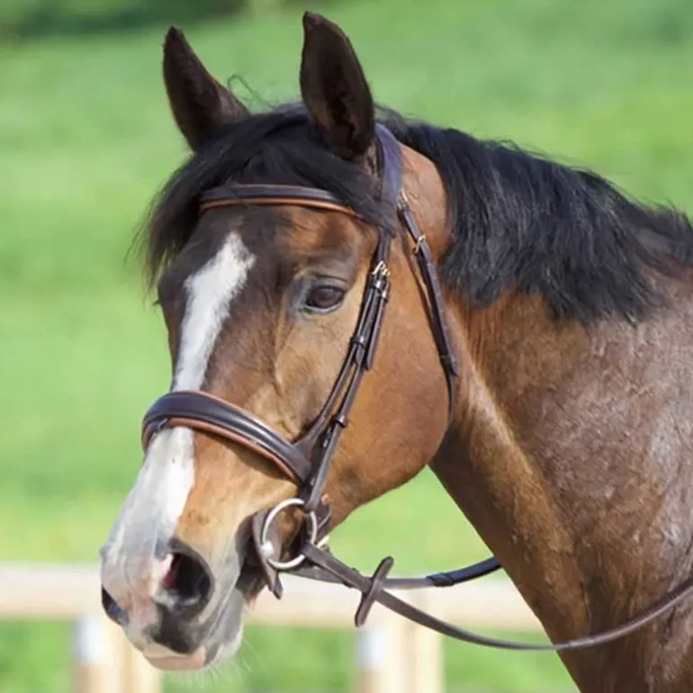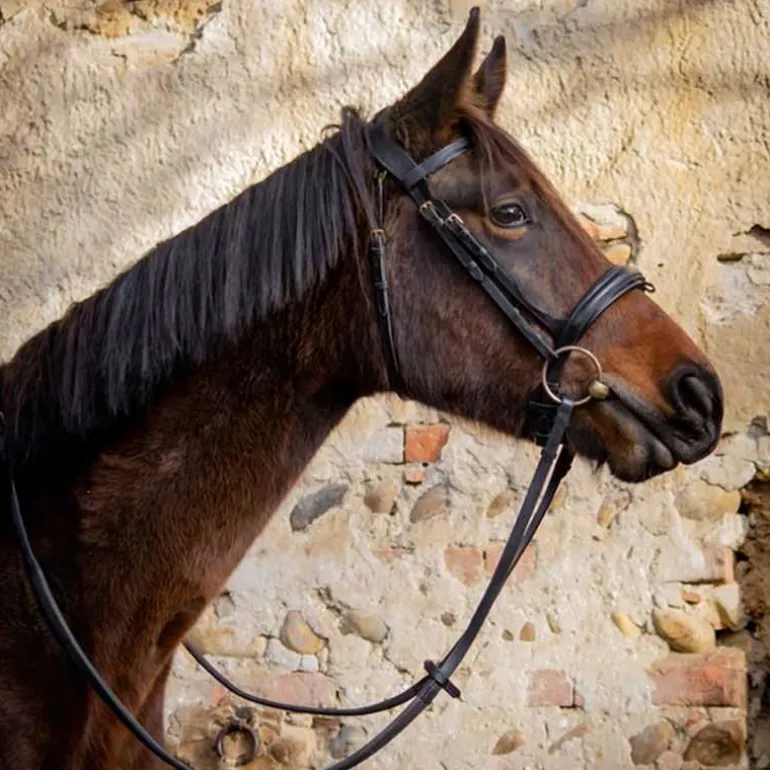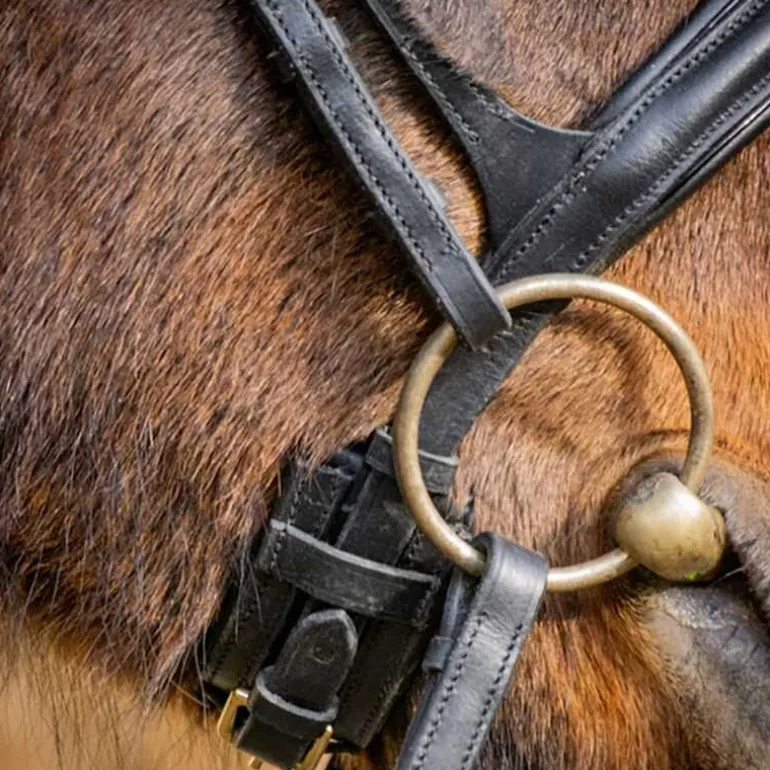 Le bridon est livré avec des rênes en caoutchouc à gros picots et une bouclerie lyre en laiton, alliant solidité et raffinement.