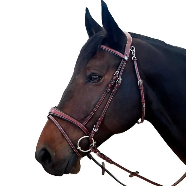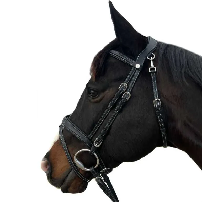 Frontal et muserolle finement surpiqués et doublés de cuir contrasté.