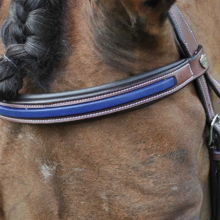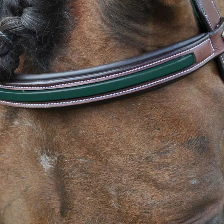 Têtière large anatomique pour le plus grand confort de votre cheval, doublée, embossée en cuir contrasté assorti et estampée Flags&Cup.