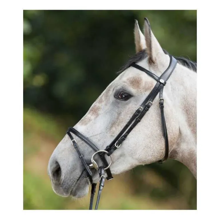 Pas de superflu, juste l’essentiel, une muserolle combinée avec noseband amovible, frontal et muserolle arrondis, têtière anatomique rembourrée et doublée de cuir souple.