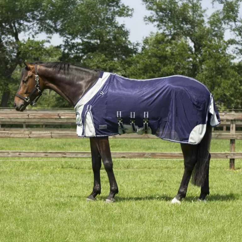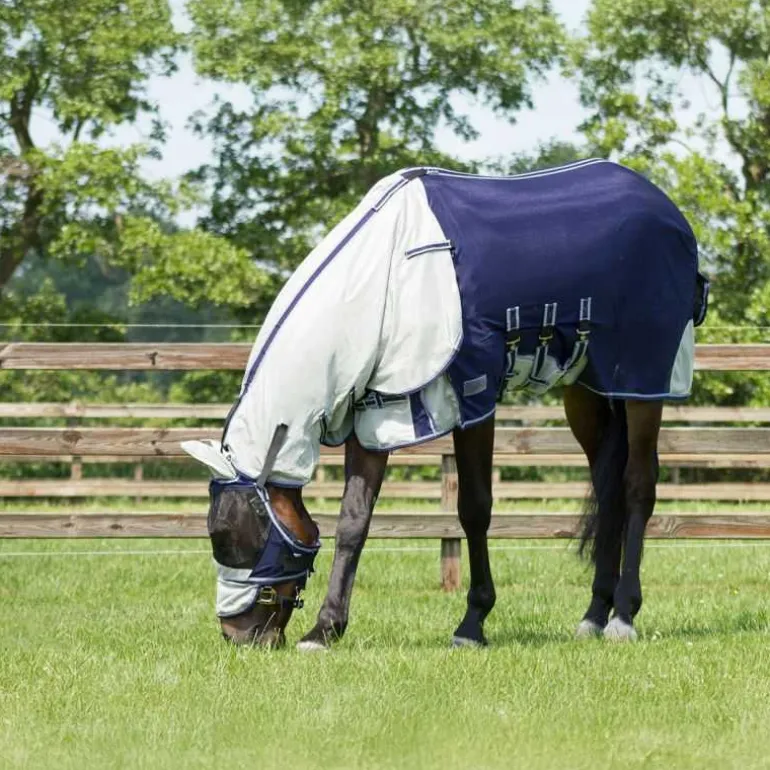 Protégez votre cheval intégralement avec la chemise anti-mouches avec cou et masque QHP – bleu.