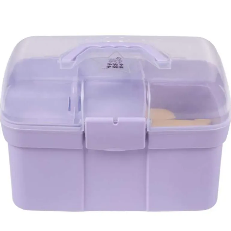 Joli coffre de pansage avec couvercle transparent et poignée pour le transport.