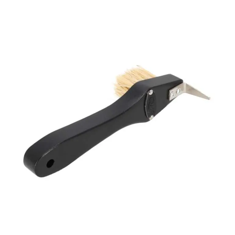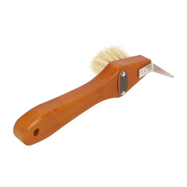 Cure-pieds Royal QHP, manche en bois, 1 côté avec cure-pieds en métal et 1 côté avec brosse, pour curer les pieds de votre cheval efficacement.