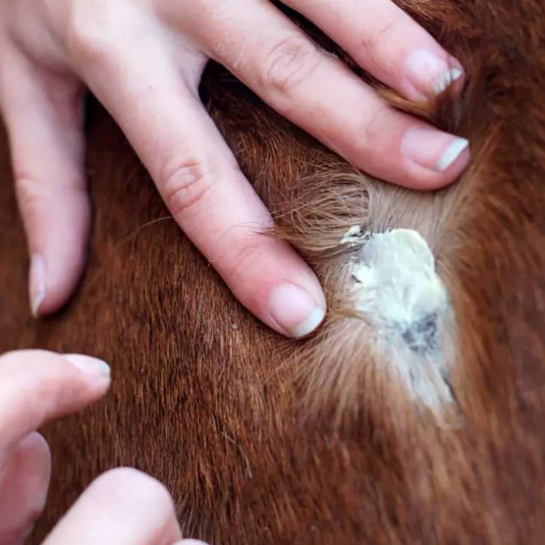 Elle assainit et isole des agressions externes, qu’il s’agisse d’insectes ou de crevasses, tout en prévenant les irritations liées aux frottements mécaniques (paturons, garrot, passage de sangle).