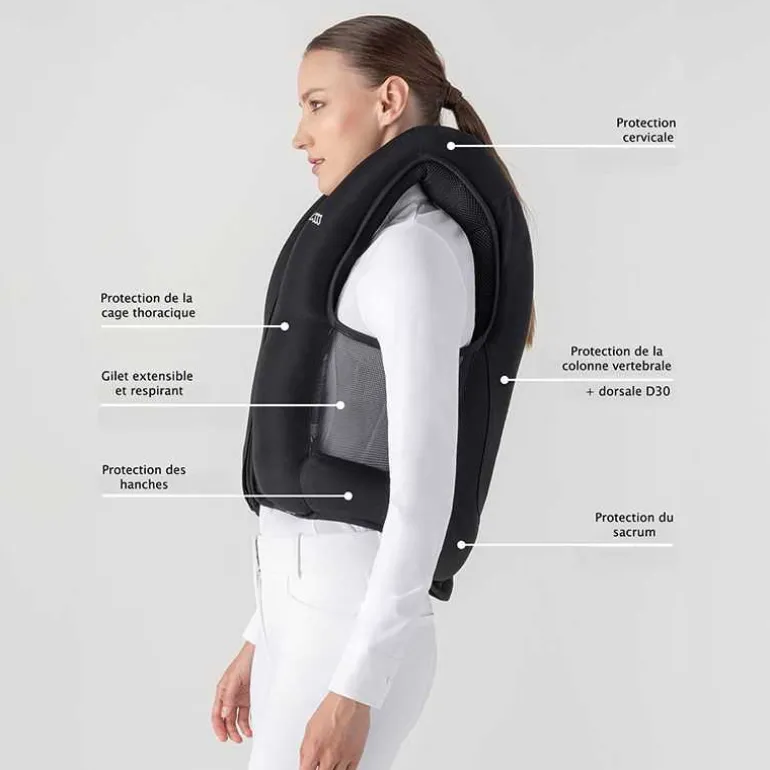 Il protège les cervicales, la colonne vertébrale, le sacrum, les hanches et la cage thoracique. La colonne vertébrale est doublement protégée puisque le gilet comporte une protection dorsale D30 de niveau 1.