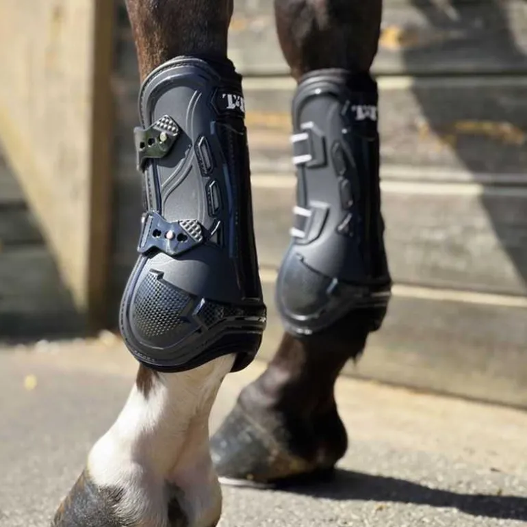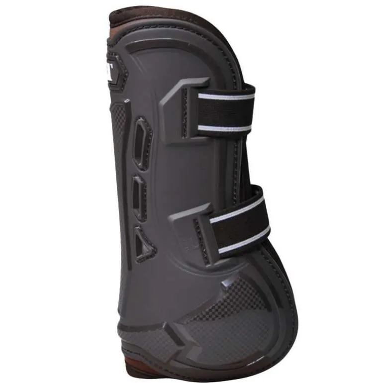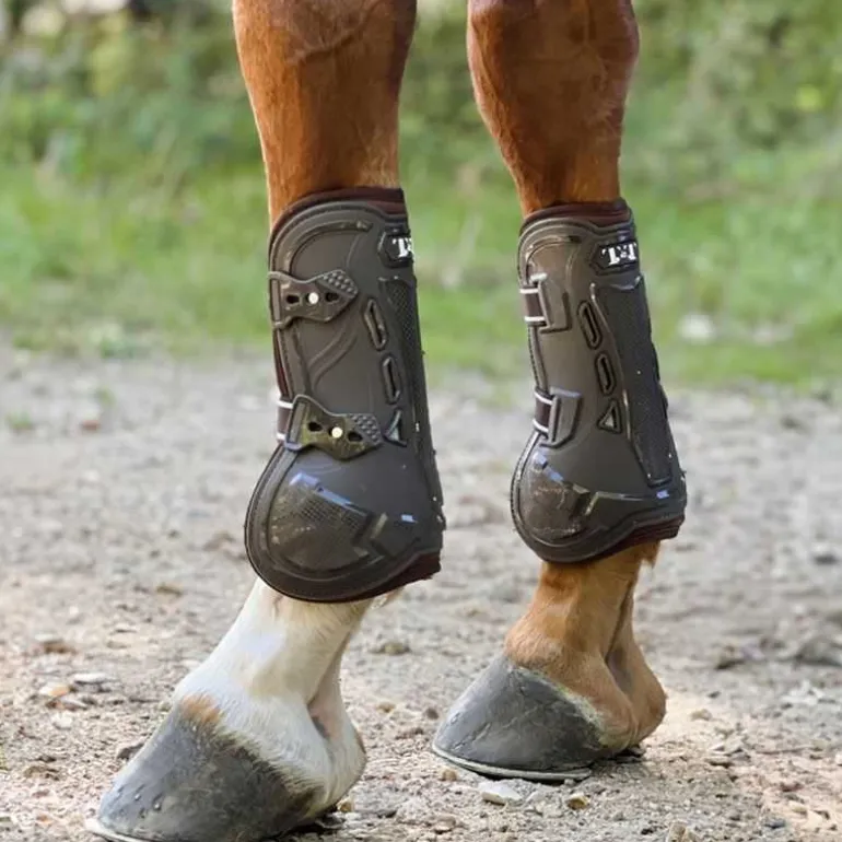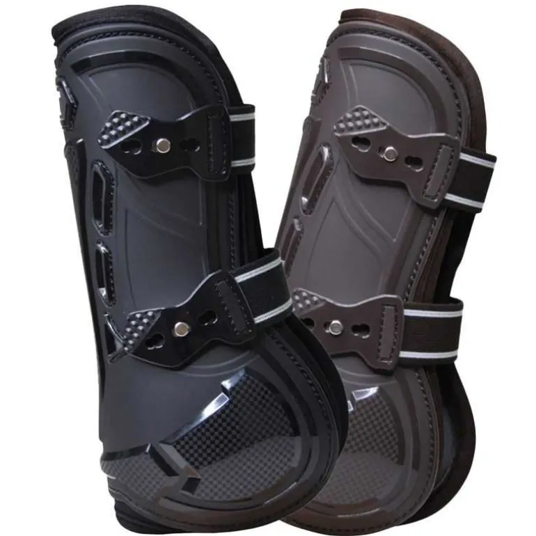 La coque externe est réalisée en super TPU, matériau sélectionné pour son excellente absorption des chocs, tout en restant souple à la flexion. Cette souplesse permet au cheval de conserver une liberté de mouvement naturelle, notamment sur la flexion du genou grâce à la découpe arrière optimisée.