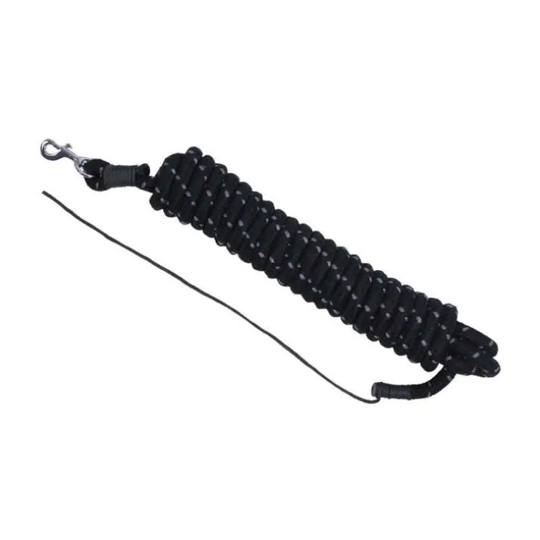 Une longe très longue avec mousqueton, très bien finie et résistante, suffisamment longue pour travailler à distance de votre cheval et en sécurité.