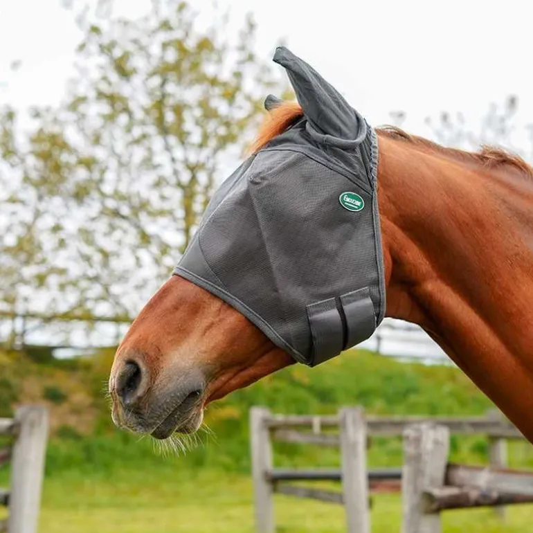 Protégez votre cheval des insectes nuisibles et des rayons UV nocifs avec le masque anti-mouches Emouchine avec oreilles de Ravene.