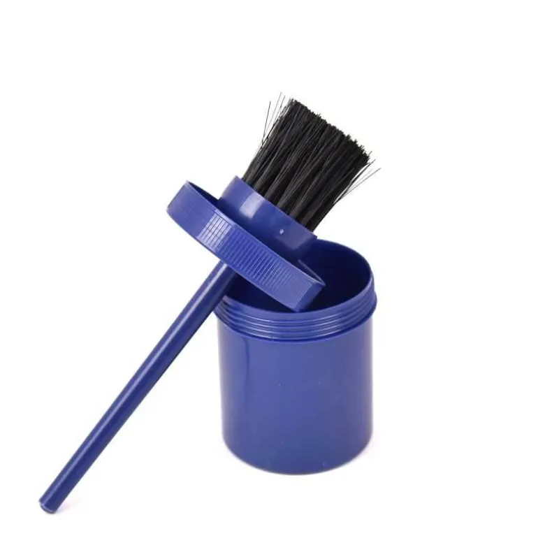 Le pinceau est rond Ø 3 cm env, en poils synthétiques longs 3.5 cm env, et il se visse dans un pot pour le ranger proprement en fin d’utilisation, sans salir votre boite de pansage.