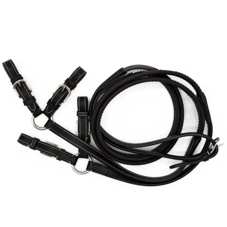Rênes à alliance Flags&Cup, en cuir et caoutchouc. Ces rênes sont terminées par des alliances combinées, idéales dans l’utilisation d’un mors Pelham.