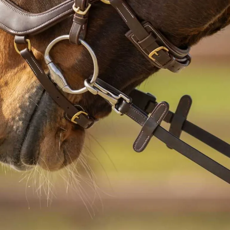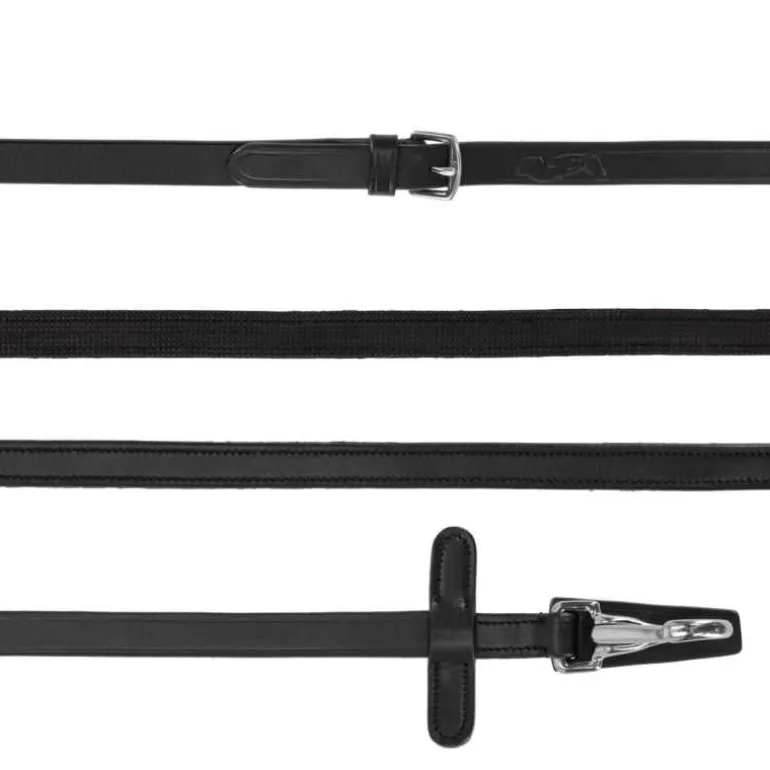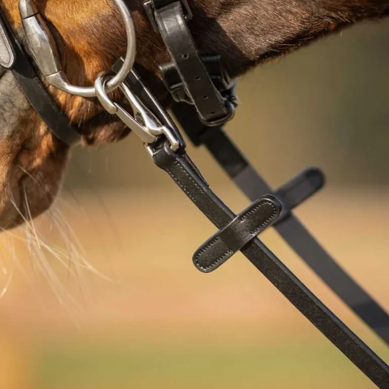 Recouverte de caoutchouc, les rênes antidérapantes avec mousqueton QHP permettent une bonne prise en main, confortable et précise.