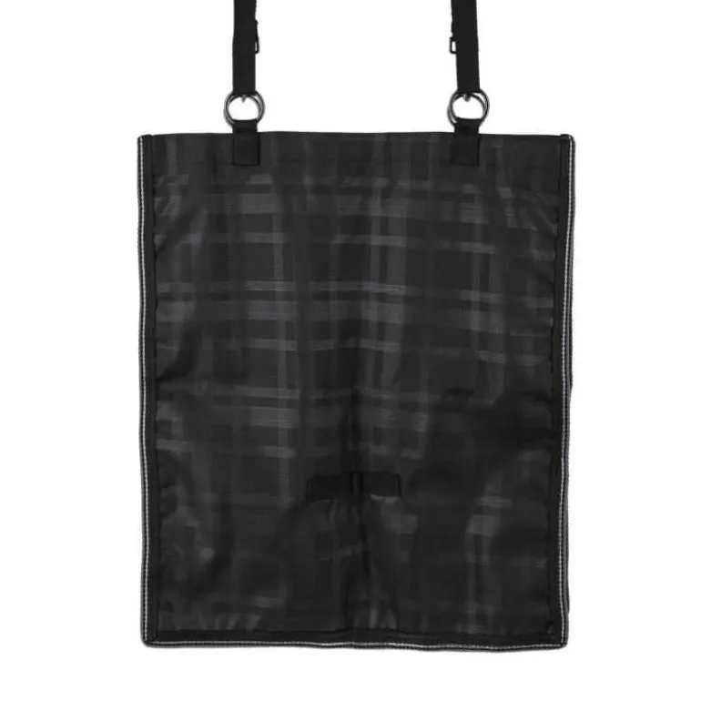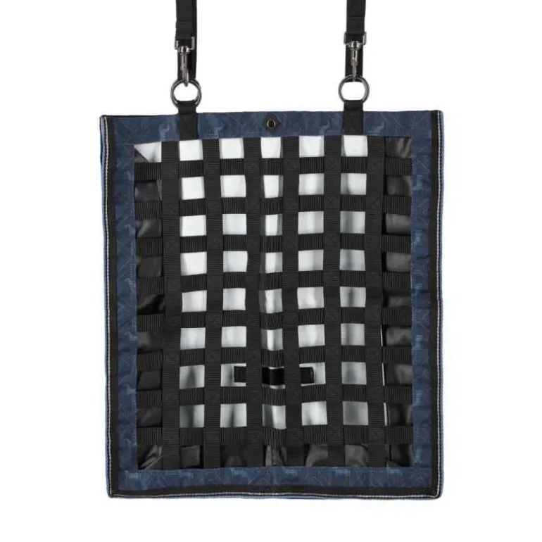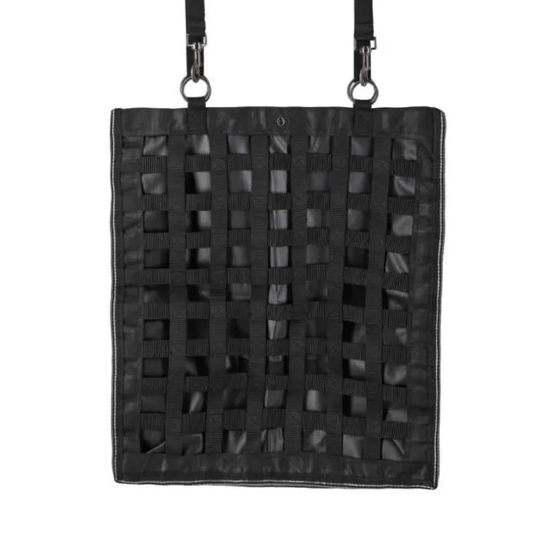 Sac à foin avec filet en polyester à larges bandes, fixation par 4 anneaux et sangles avec mousquetons ajustables.