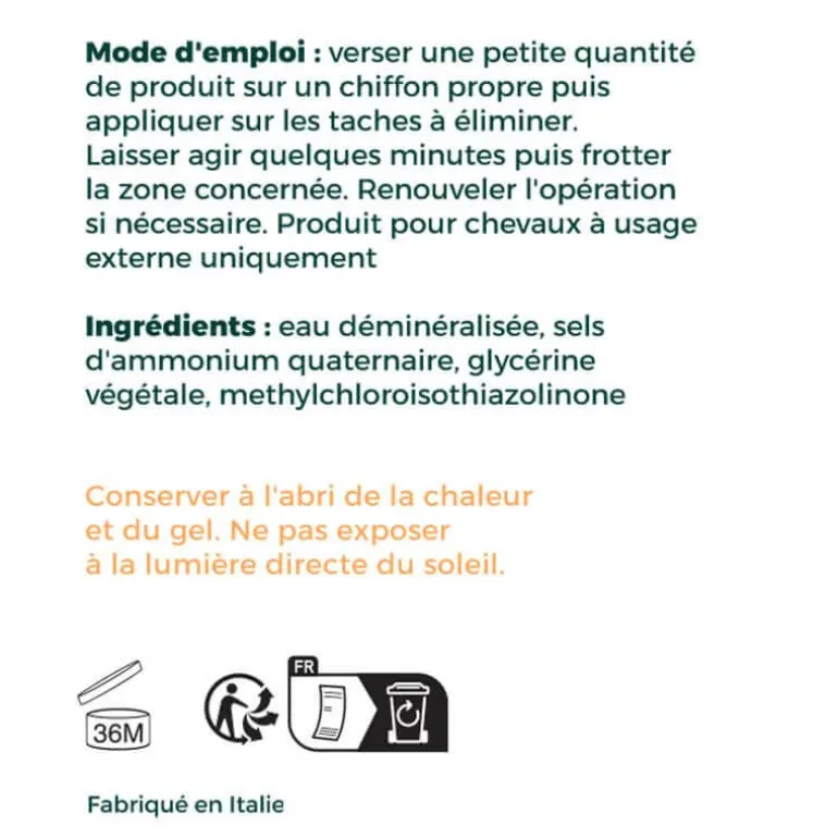 Mode emploi: Verser une petite quantité de produit sur un chiffon propre puis appliquer sur les tâches à éliminer.