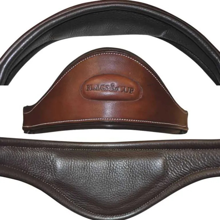 La têtière en cuir souple et confortable, estampée Flags&Cup, est livrée avec une sous-gorge avec mousqueton de chaque côté.