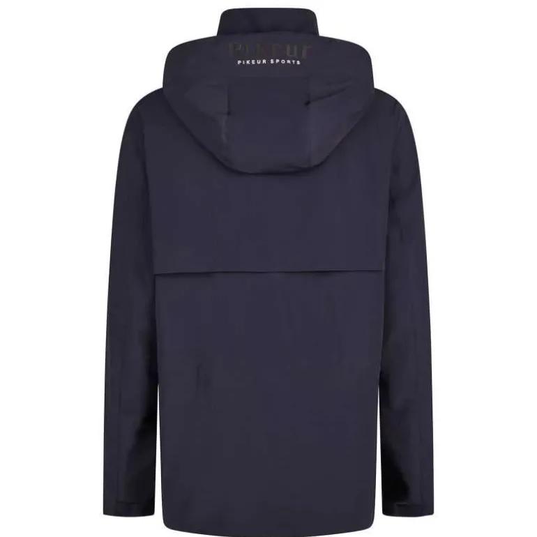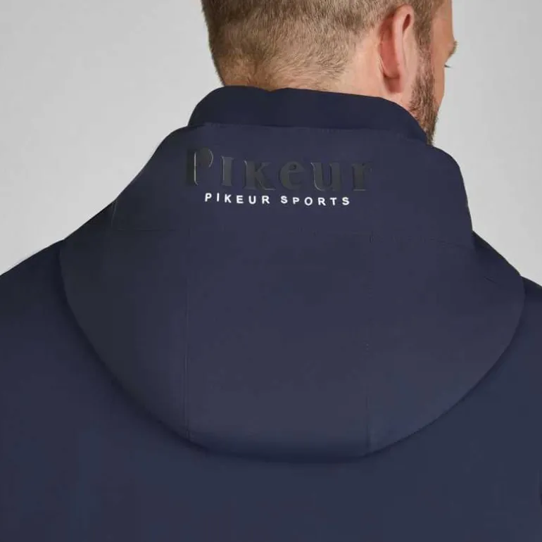 Veste imperméable pour homme Pikeur Sports avec capuche amovible, fixée par zip et par un aimant dans le dos pour la garder en place à cheval sans vous gêner.