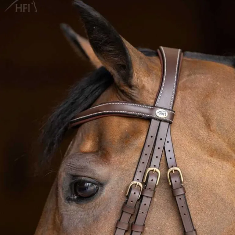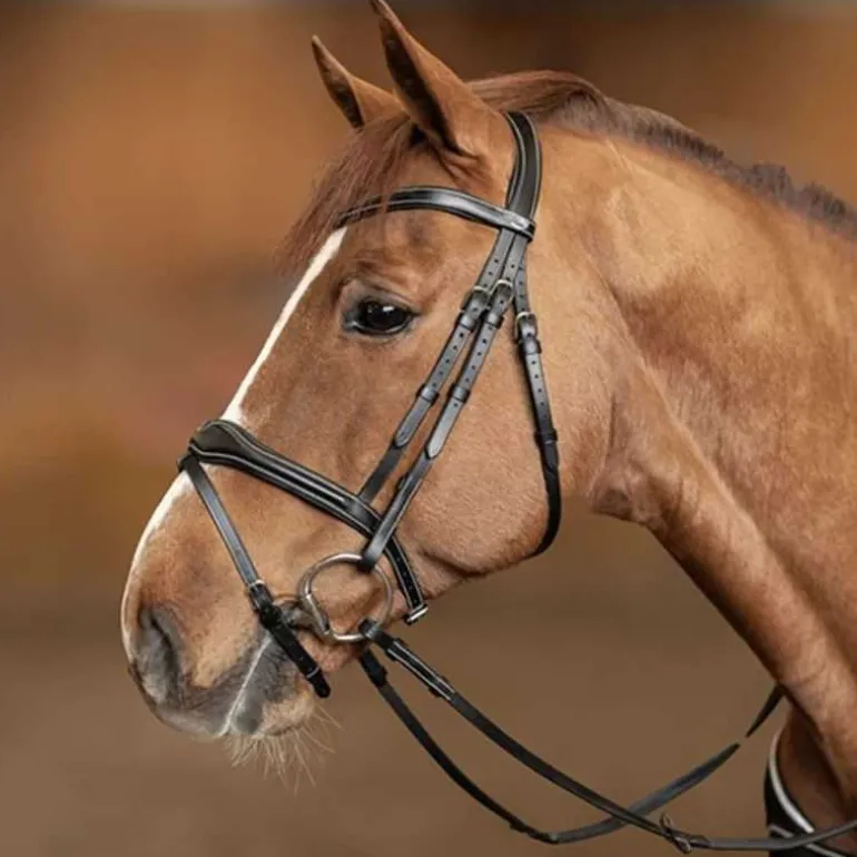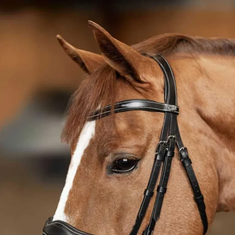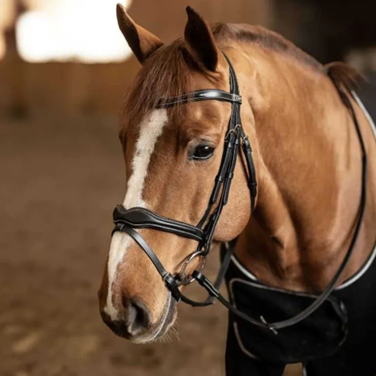 Frontal et têtière anatomiques rembourrés et doublés de cuir souple.