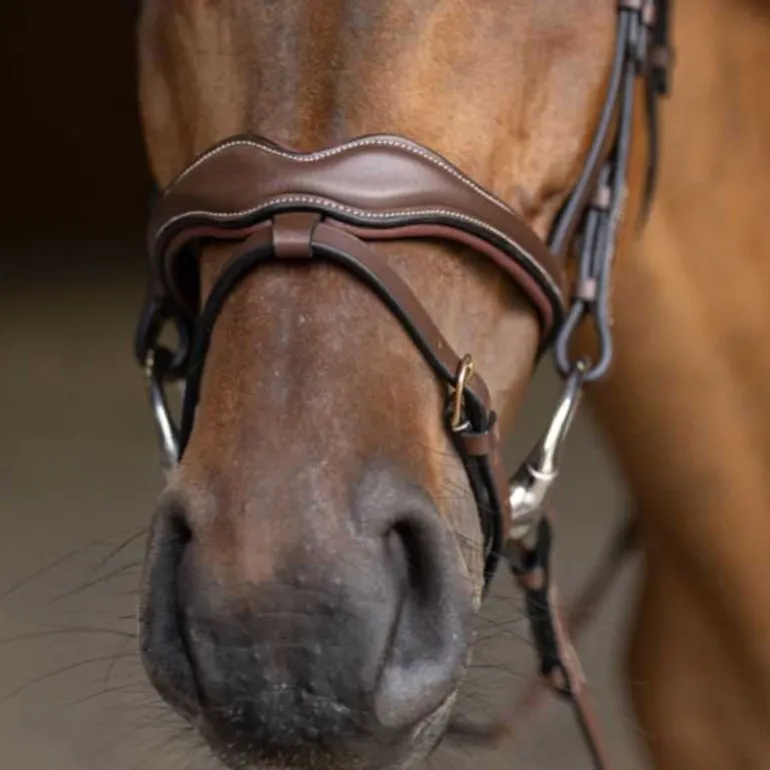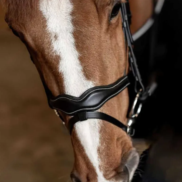 Une muserolle « vague » très originale et chic, combinée et doublée de cuir souple pour le plus grand confort de votre cheval.