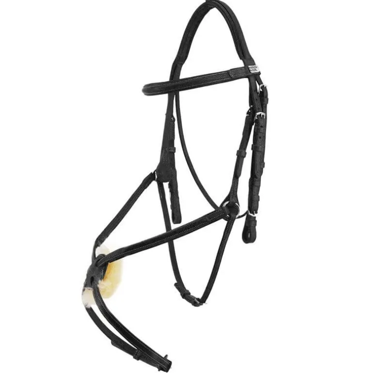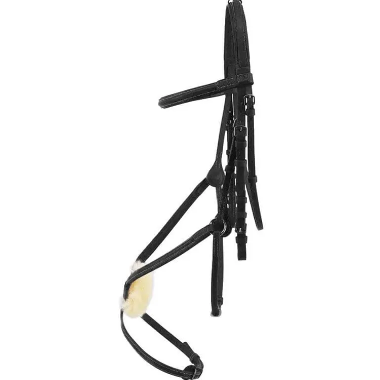 La muserolle est élargie sous la boucle pour éviter le contact direct avec le cheval et passe au dessus de la têtière pour mieux répartir la pression.