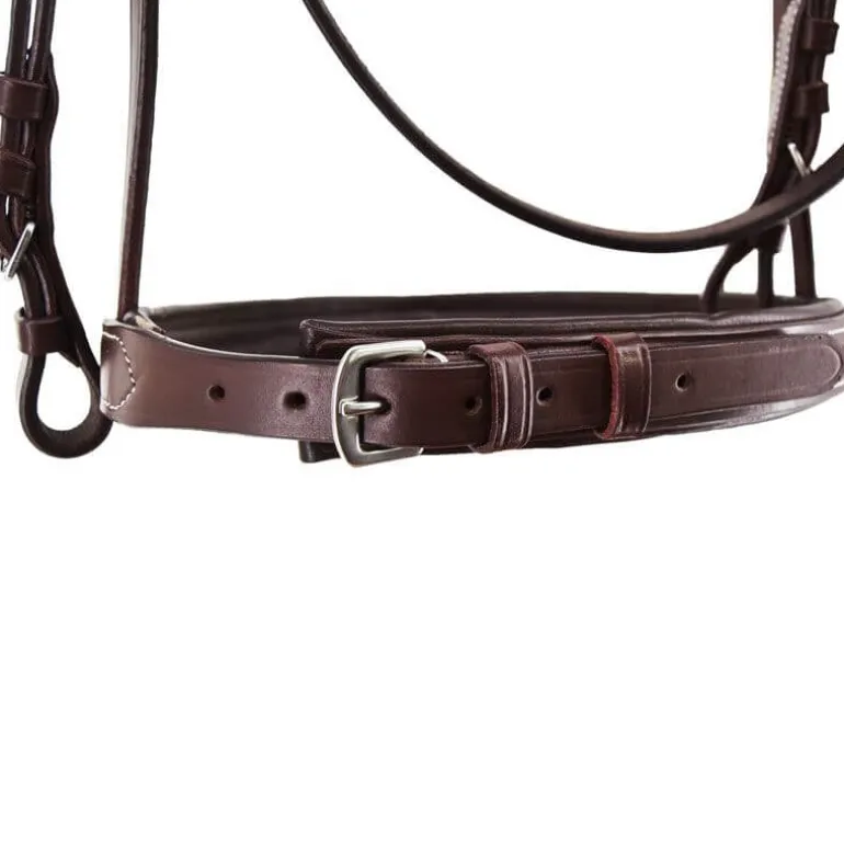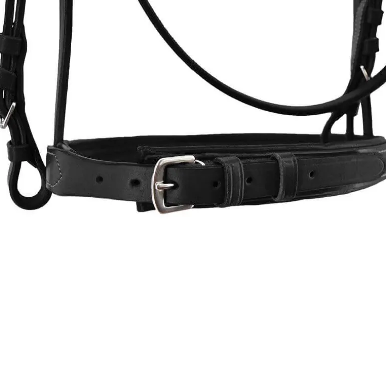 La muserolle est élargie sous la boucle pour éviter le contact direct avec le cheval et passe au dessus de la têtière pour mieux répartir la pression.