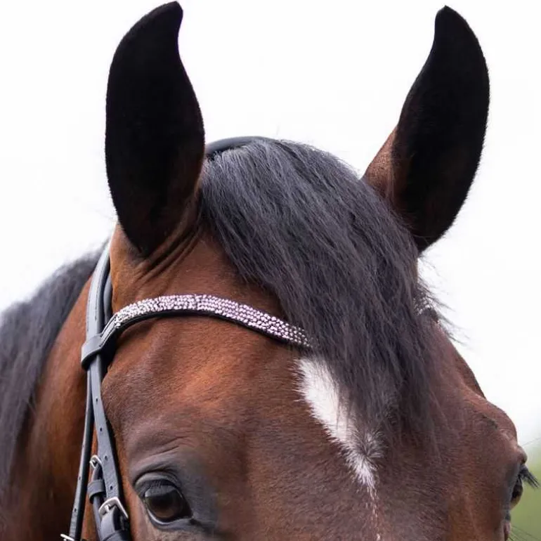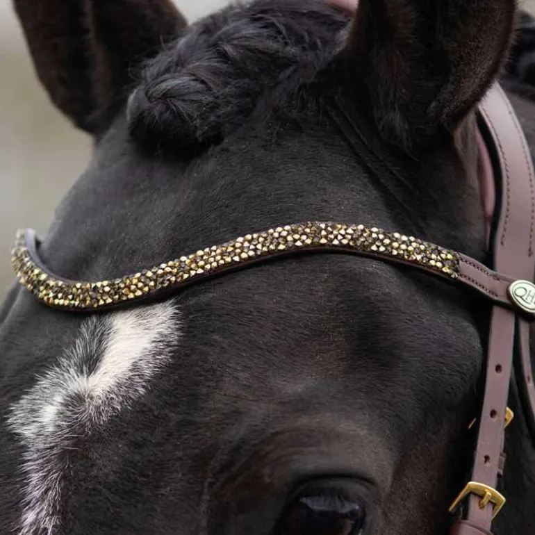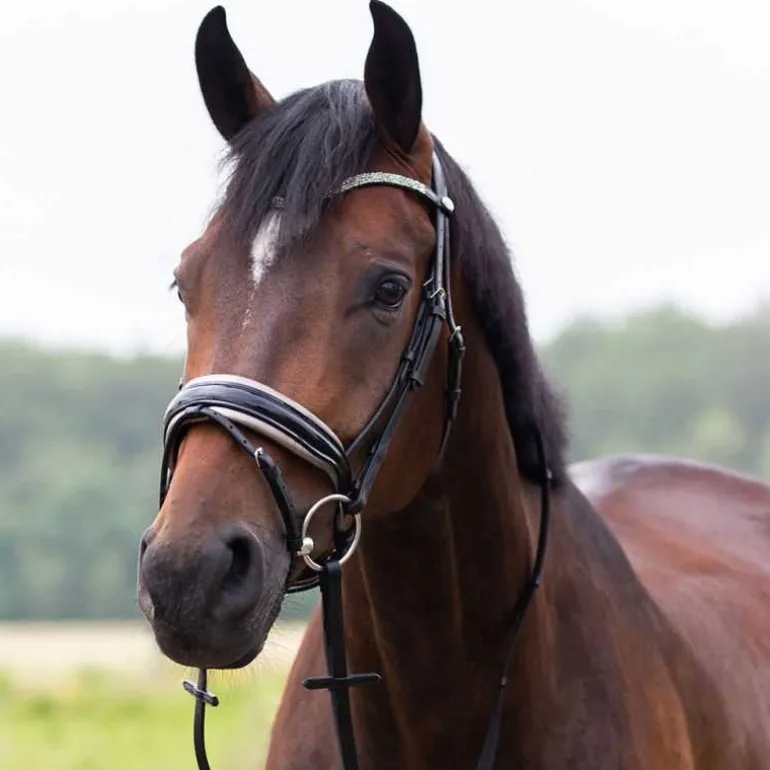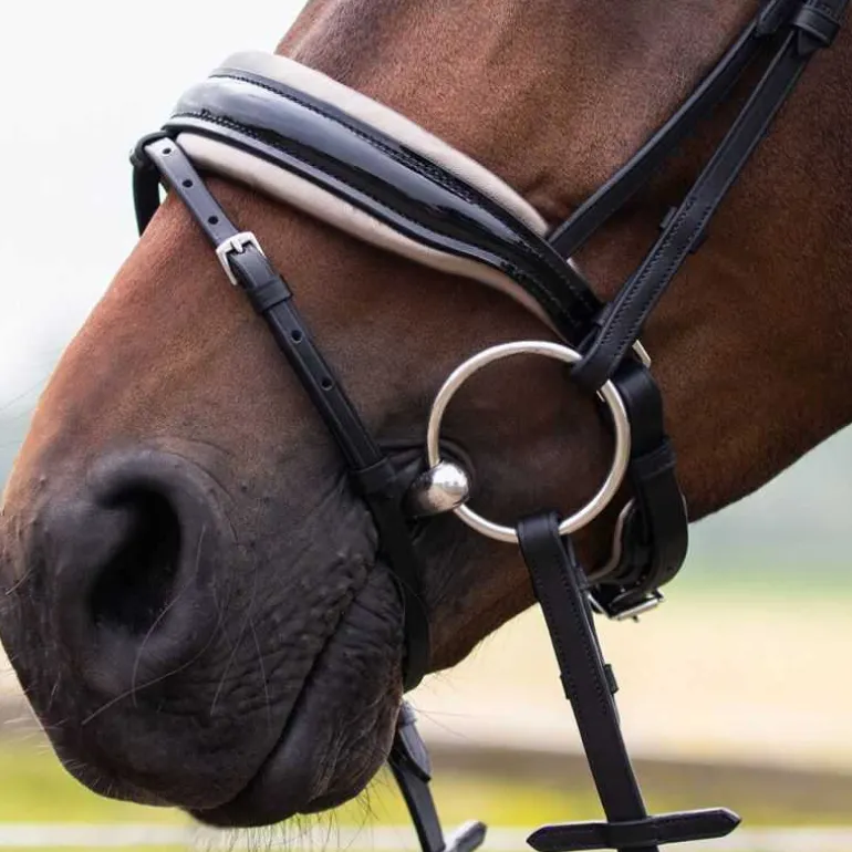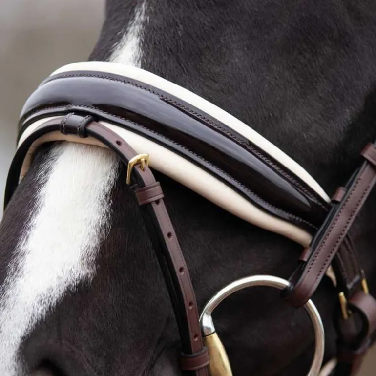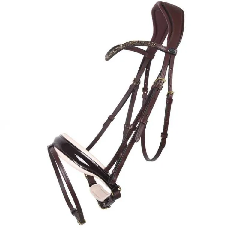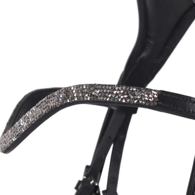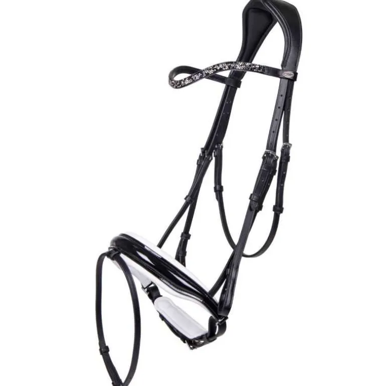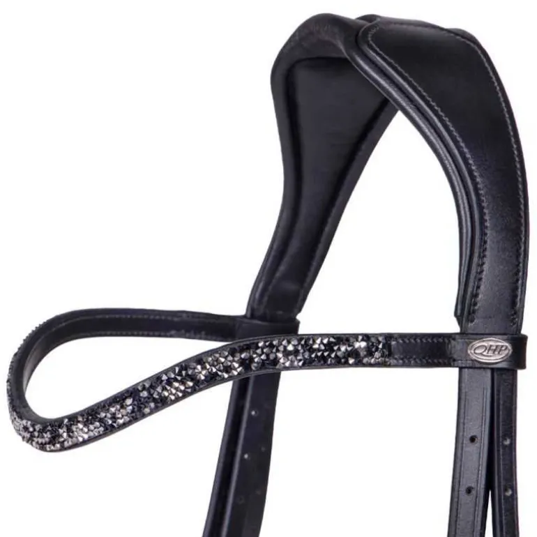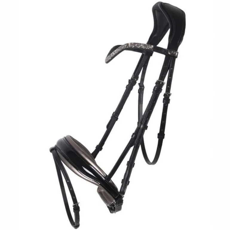 Bridon Lupine QHP en cuir, ultra élégant avec sa muserolle large vernie avec doublure contrastée et son fin frontal à strass en forme de diamants scintillants.