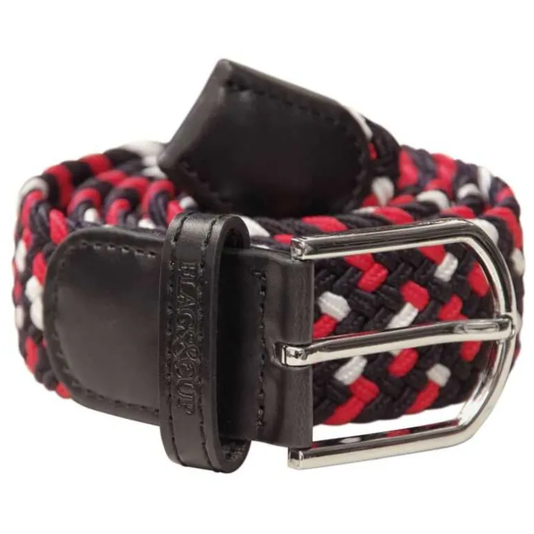 La ceinture est tressée en élastiques tricolores avec une boucle rectangulaire aux bords arrondis.