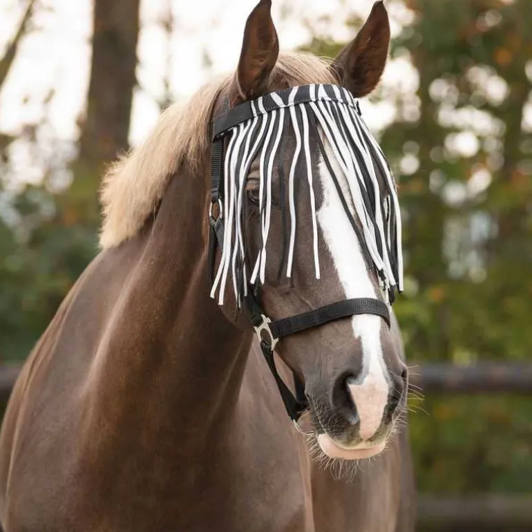 Avec le frontal Chasse Mouche Q-Essentials Zèbre, votre cheval va pouvoir chasser les insectes facilement sans contrainte. Le frontal est léger et se fixe par velcro à un licol ou un bridon.