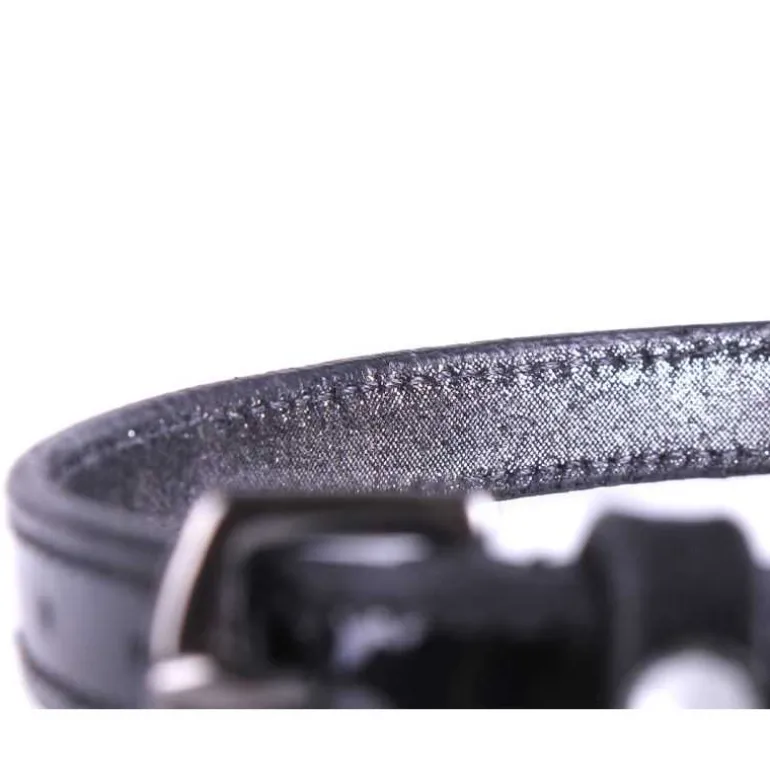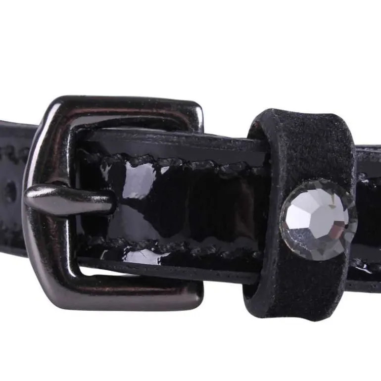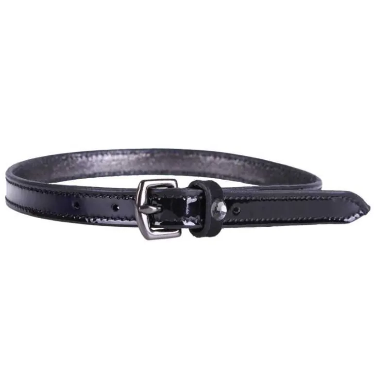 Lanières d’éperons Calypso QHP en cuir verni noir avec finitions en daim et bouclerie en acier inoxydable de couleur argent.