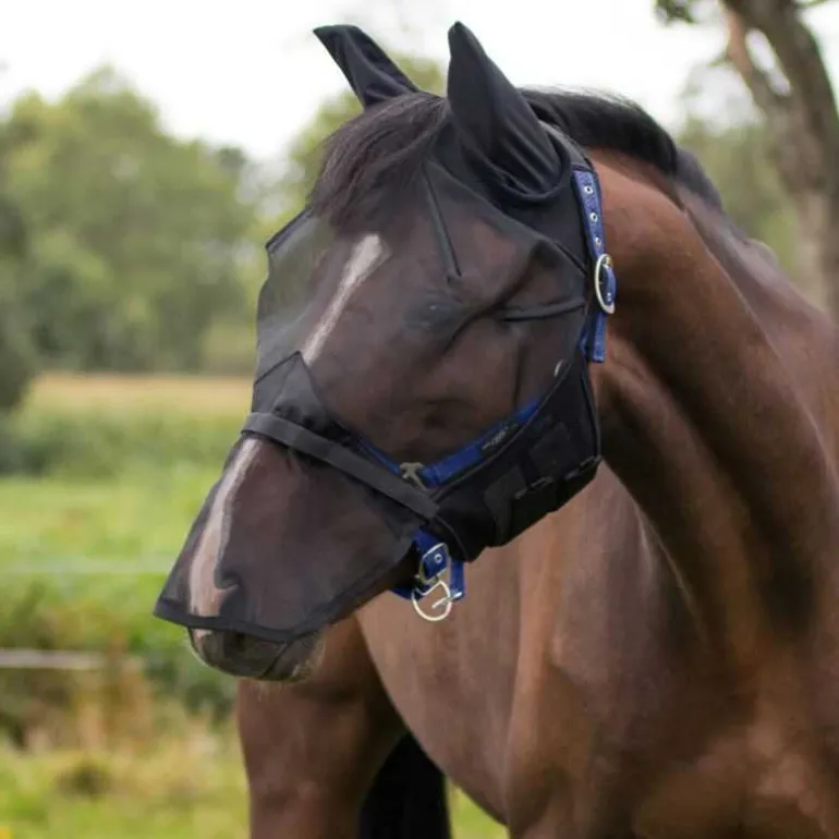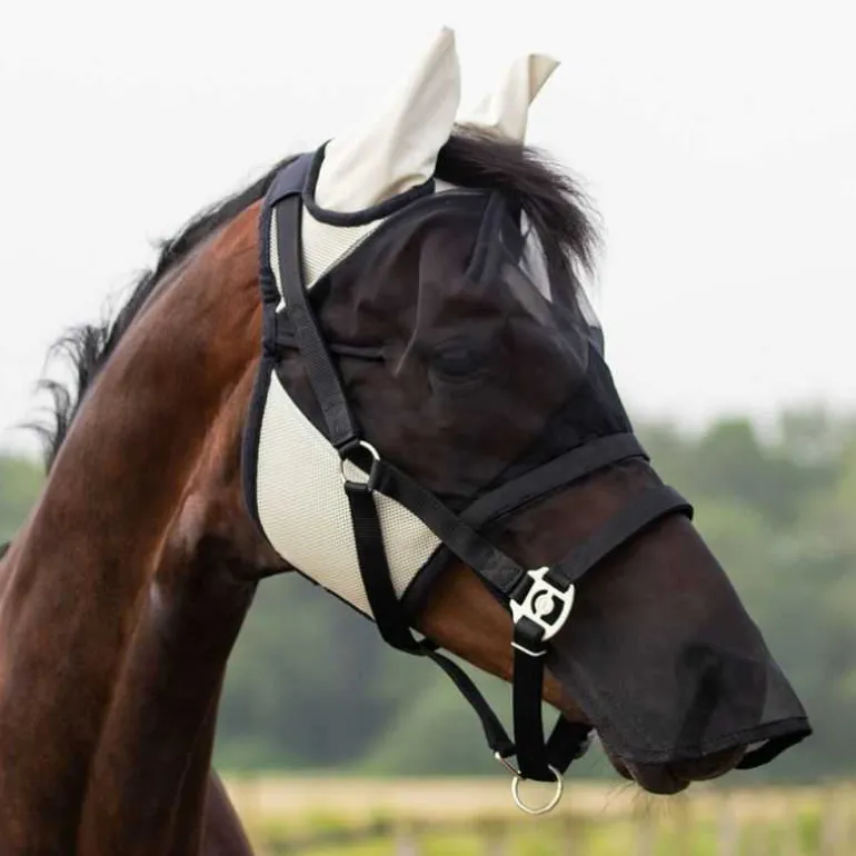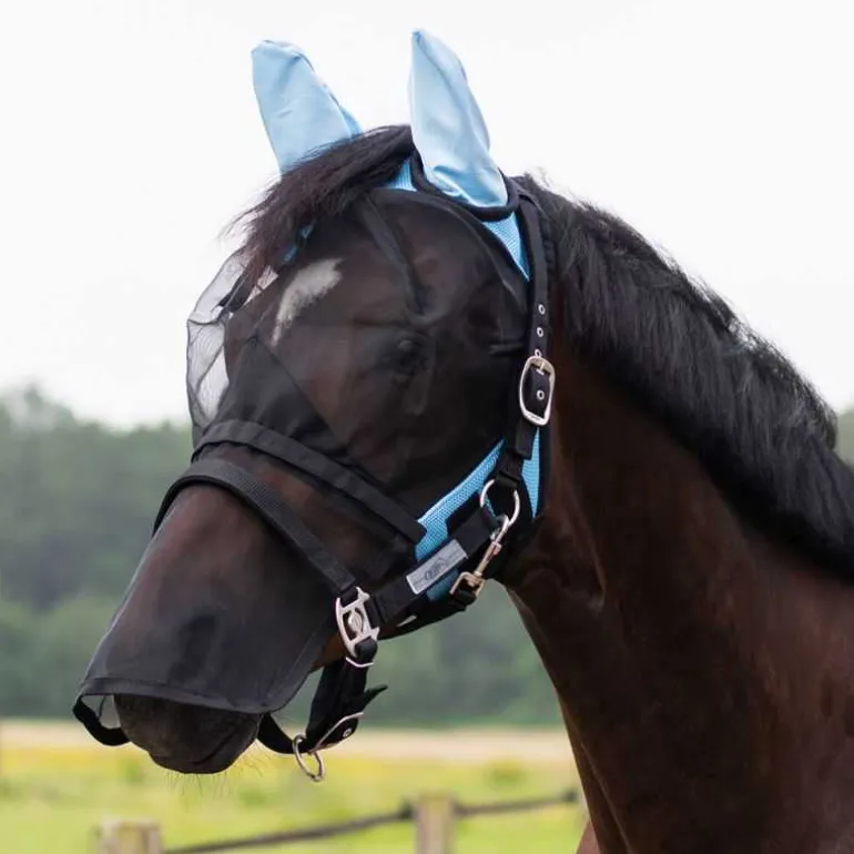 Masque anti-mouches avec bout de nez amovible QHP, le rabat sur le nez est fixé par velcro et se détache facilement.