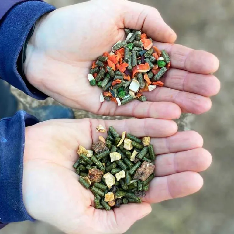 Composition gamme légumes : luzerne séchée à haute température ; herbe séchée à haute température ; carotte séchée (14%) ; pois séché (6%), panais séché (5%) ; betterave séchée (5%) ; huile de colza.