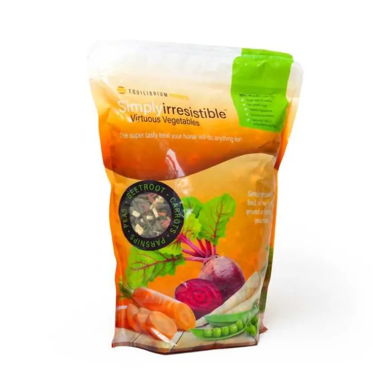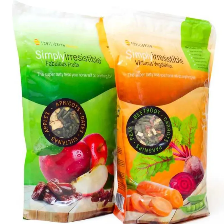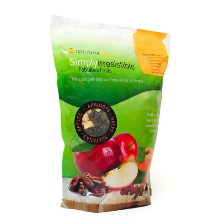 Riches en antioxydants et probiotiques, le mélange Simply irresistible Equilibrium, aux fruits ou aux légumes, est un complément alimentaire fait pour sublimer la ration alimentaire de votre cheval ou simplement pour un instant gourmand.