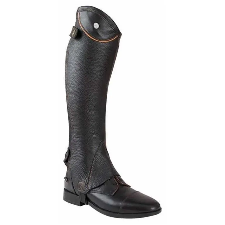 Les mini chaps Schubert T de T sont conçues en cuir de vache grainé, épais et souple, pour épouser la jambe avec précision et assurer un maintien confortable, comme une seconde peau.