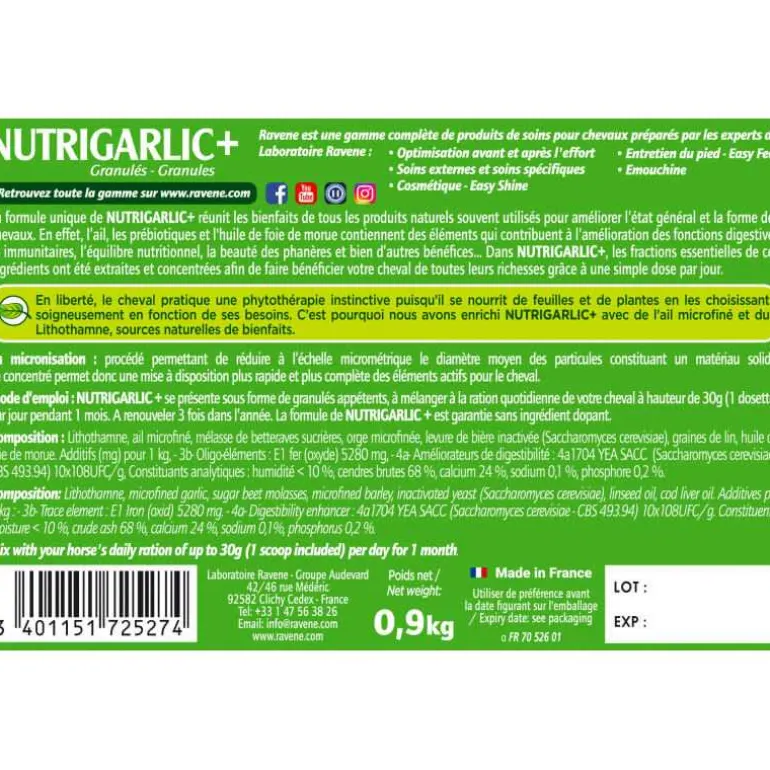 Dans NutriGarlic+, les fractions essentielles de ces ingrédients ont été extraites et concentrées afin de faire bénéficier votre cheval de toutes leurs richesses grâce à une simple dose par jour.