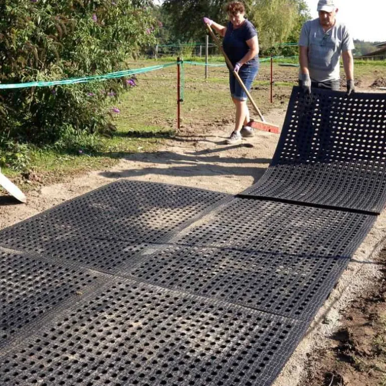 Pour vos allées, entrées de paddocks, entrées de pâturages, terrasses de box en sols naturels potentiellement boueux le Tapis de sol Belmondo® Flix sols naturels est le tapis caoutchouc idéal pour stabiliser vos sols sans danger pour les animaux.