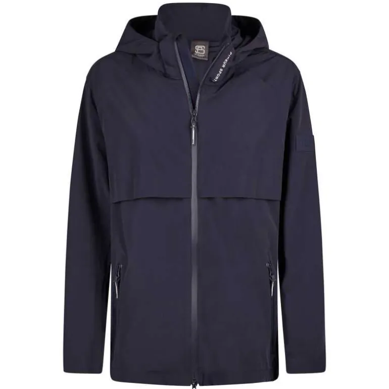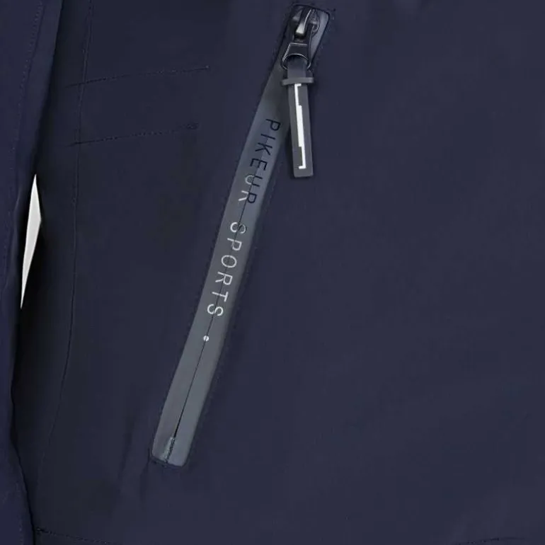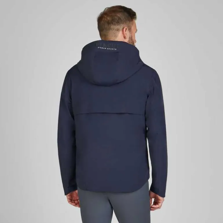 Veste imperméable pour homme Pikeur Sports avec capuche amovible, fixée par zip et par un aimant dans le dos pour la garder en place à cheval sans vous gêner.